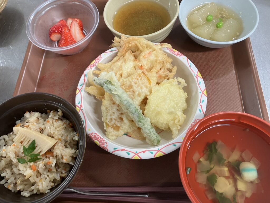 たけのこご飯、春野菜の天ぷら、いちご!