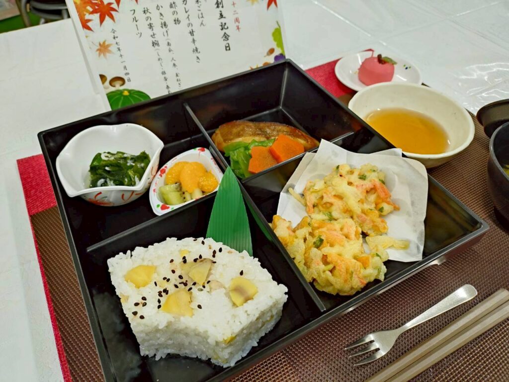 ・栗ご飯・秋旬のかき揚げ・カレイの味噌焼き・酢の物・フルーツ